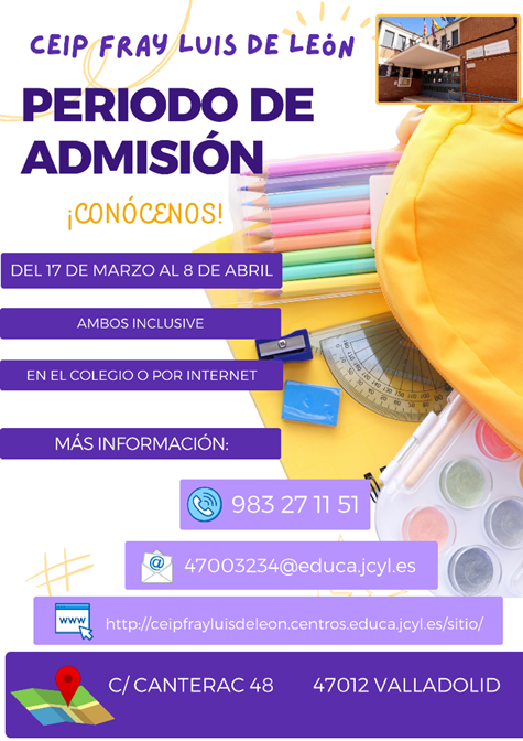 ![]() ![]() -------------------------------------------------------------------------------- DATOS DE LOCALIZACIÓN C/ Canterac Nº 48 47012 Valladolid (España) Tel. 983 271 151 47003234@educa.jcyl.es ************************* ¡¡¡ATENCIÓN!!! PERIODO DE ADMISIÓN CURSO 2026-2027